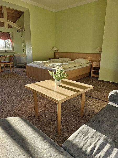 Das Zimmer selbst ist komfortabel eingerichtet und verfügt über ein gemütliches Bett, Sitzmöglichkeiten sowie ein eigenes Bad. Der Balkon macht dieses Zimmer zur idealen Wahl für Gäste, die gerne draußen verweilen und die Umgebung bewusst genießen.